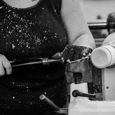 tourneuse sur bois formée au Lycée des Arts du Bois "Pierre Vernotte" de Moirans-en-Montagne (39). Elle fait une démonstration à l'Atelier des Savoirs faire à Ravilloles pendant l'exposition "De la matière à l'oeuvre" qui a lieu jusqu'au 30 octobre 2025.